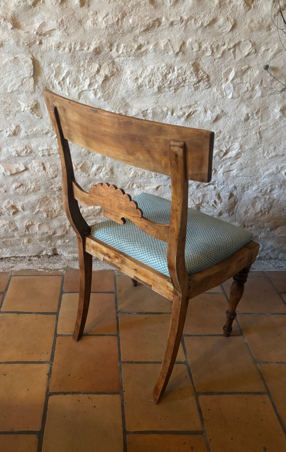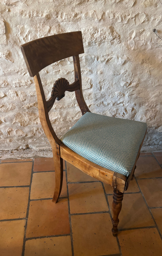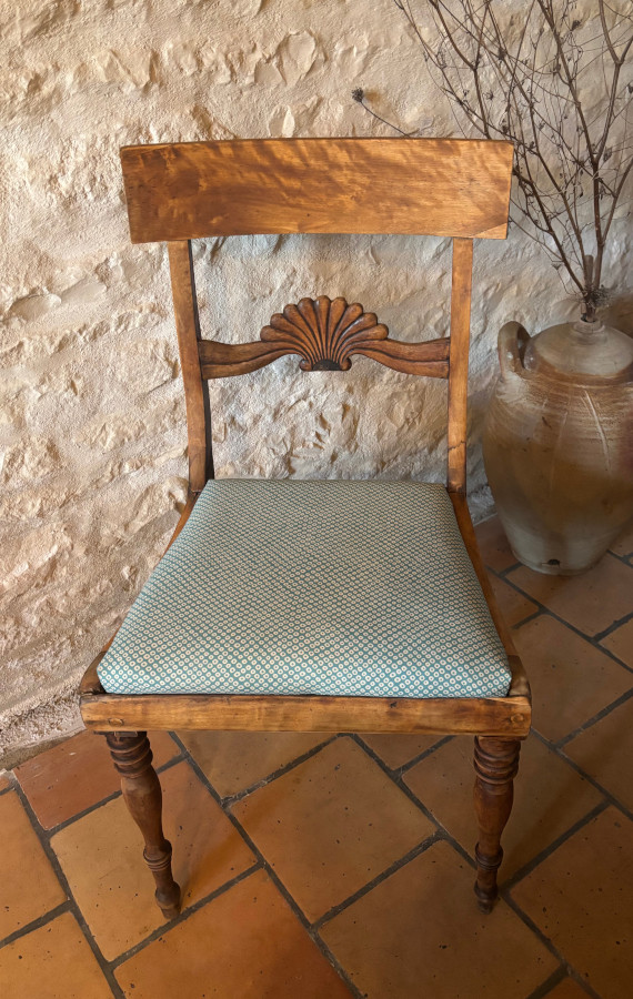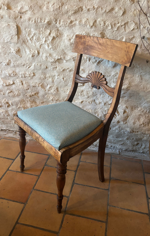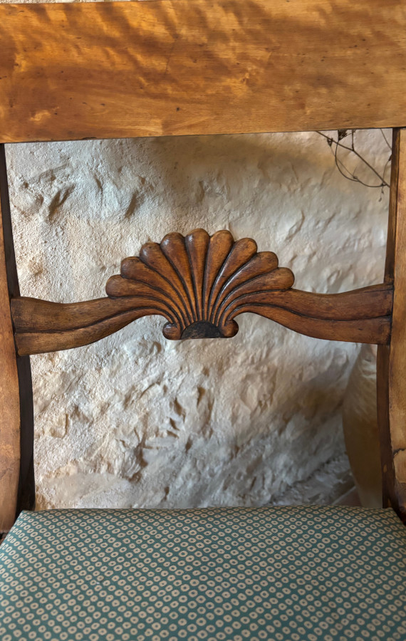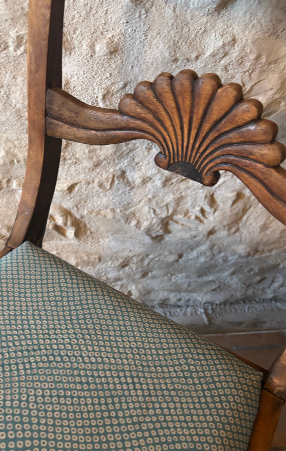Fabriquée en bois massif, elle est ornée au centre de sa traverse d’un beau motif sculpté en forme de coquille Saint-Jacques, ornement typique du style Restauration.