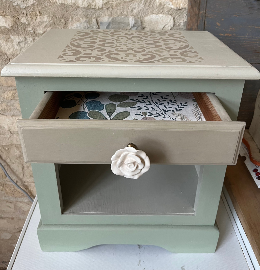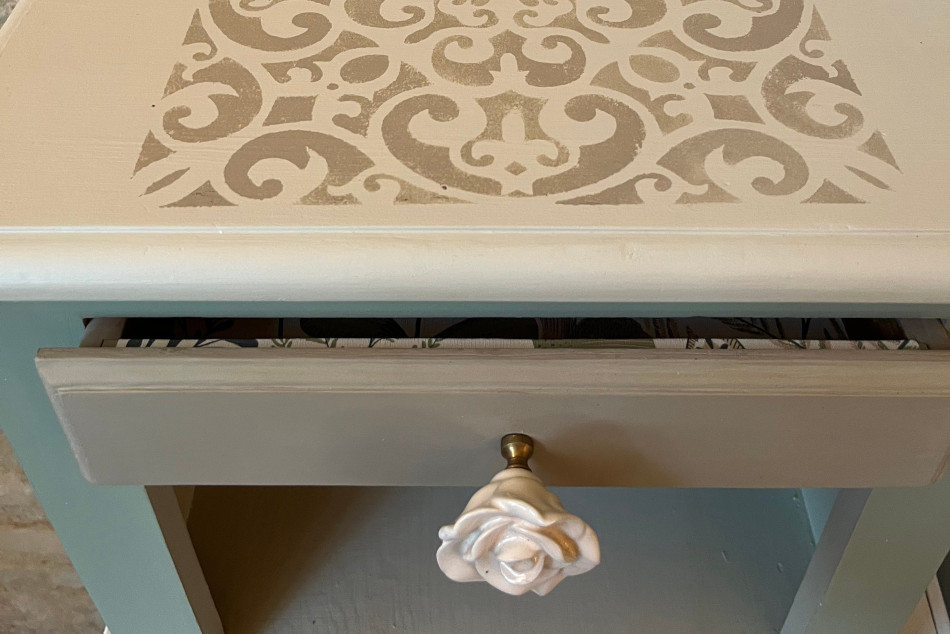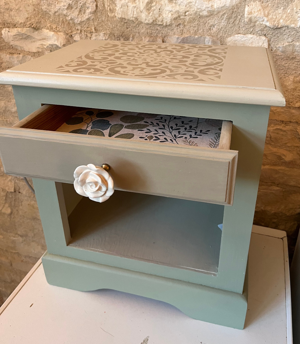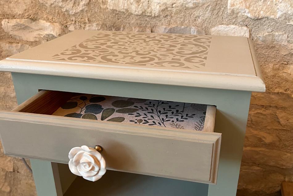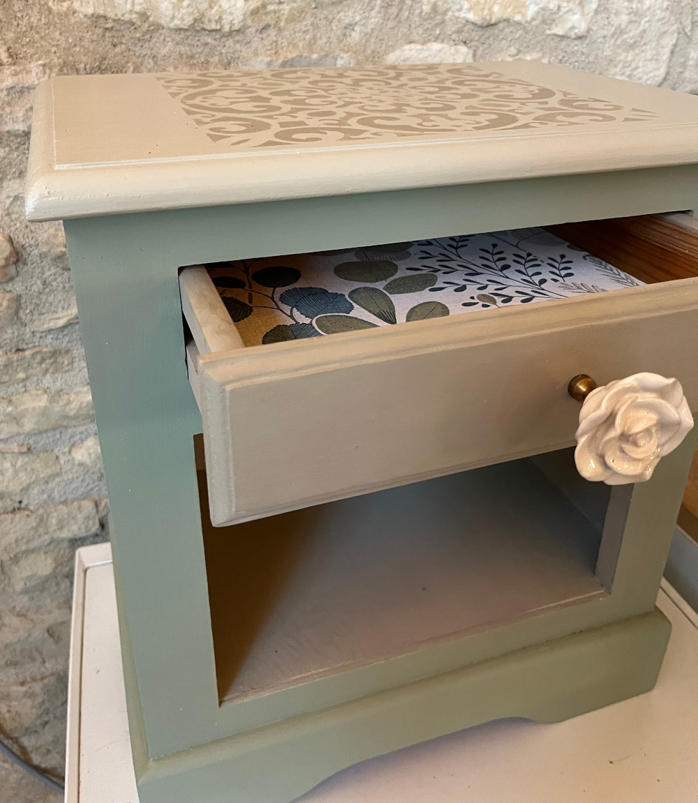 Les tiroirs, aux poignées de rose, ont été tapissés d’une jolie tapisserie colorée.