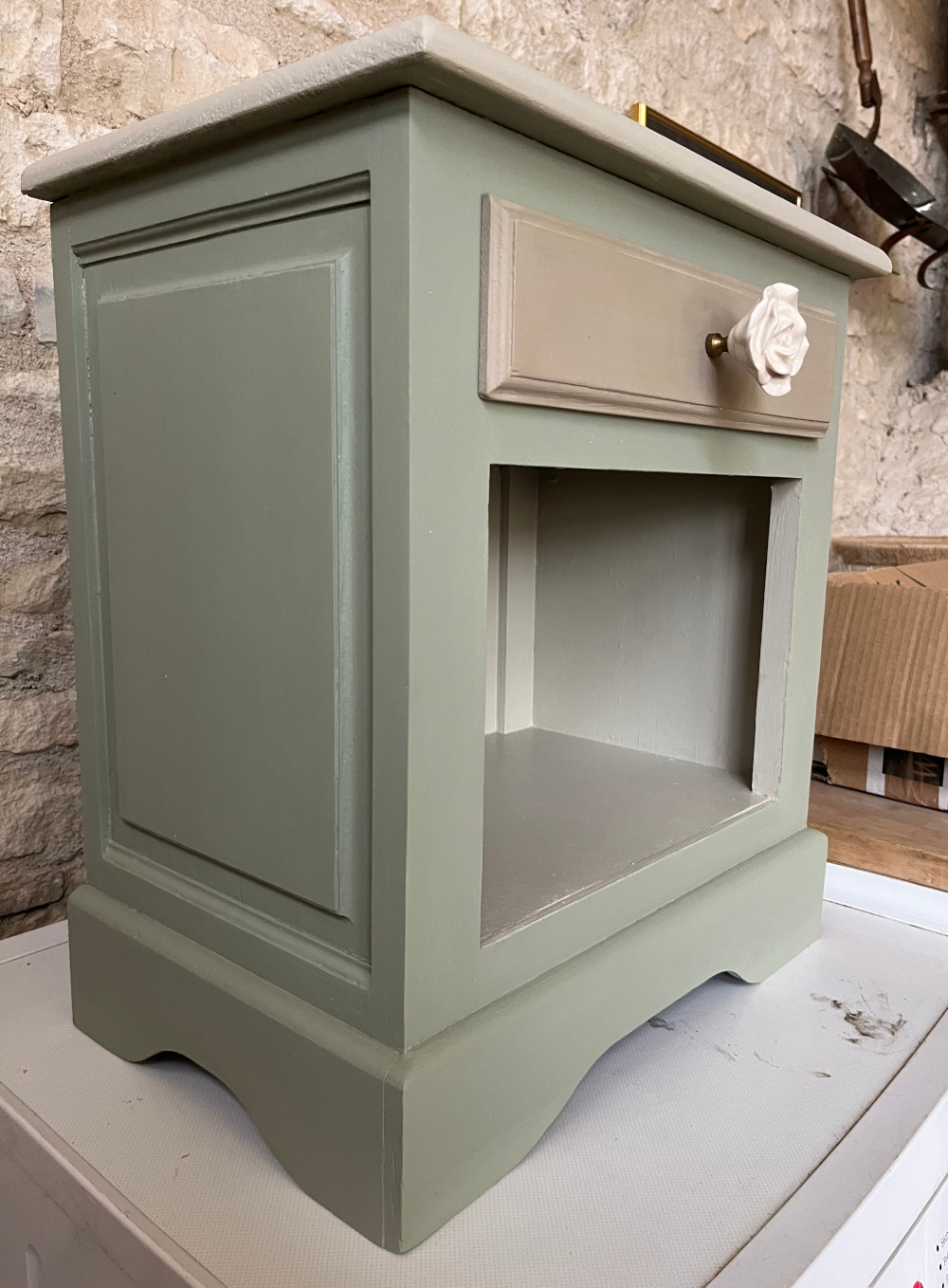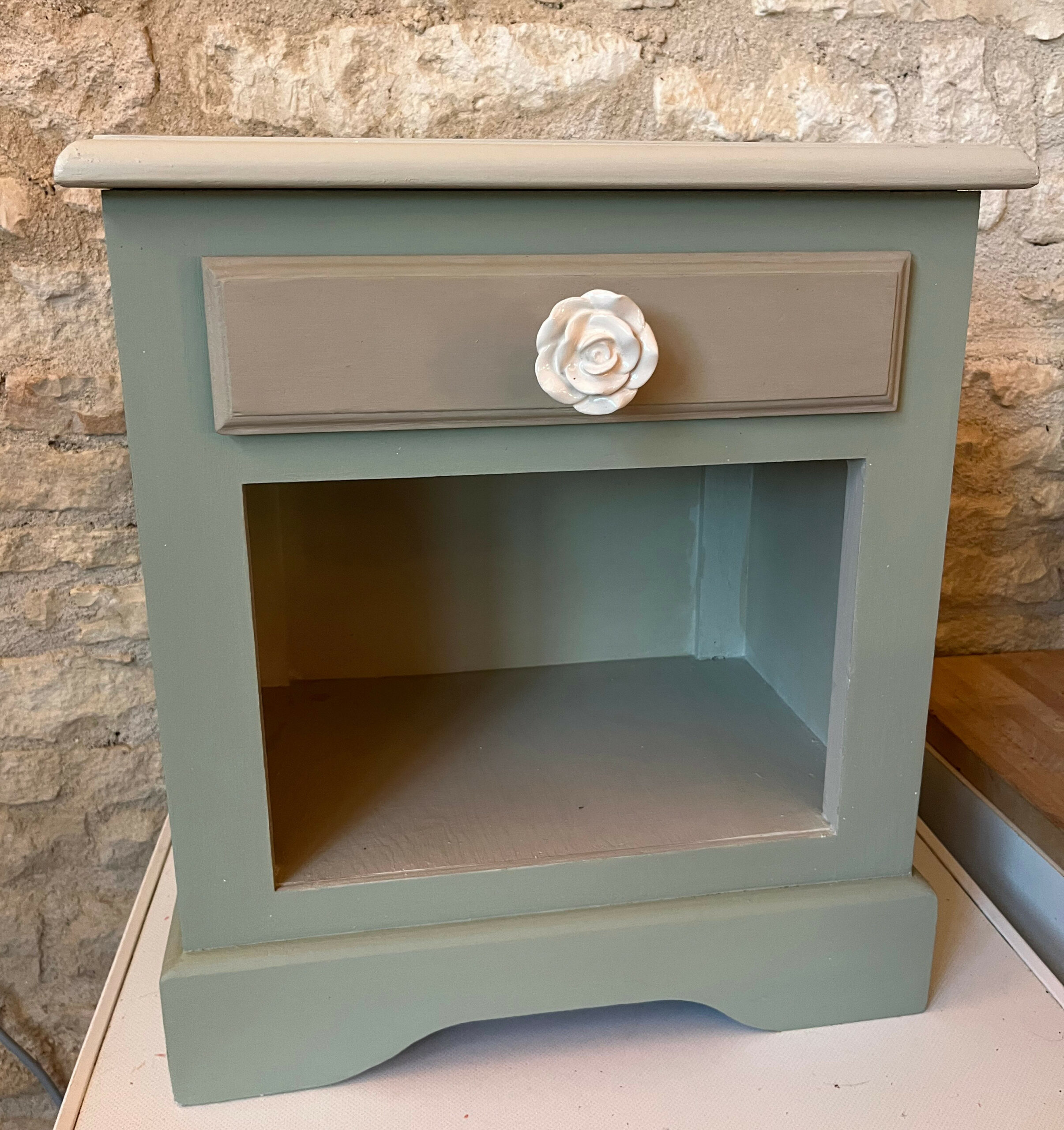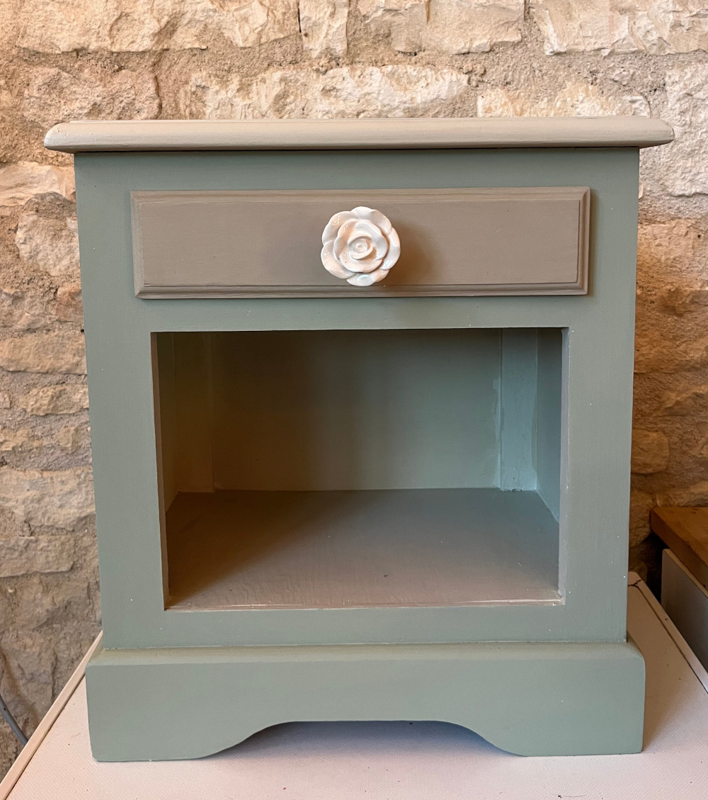 Les tiroirs, aux poignées de rose, ont été tapissés d’une jolie tapisserie colorée.