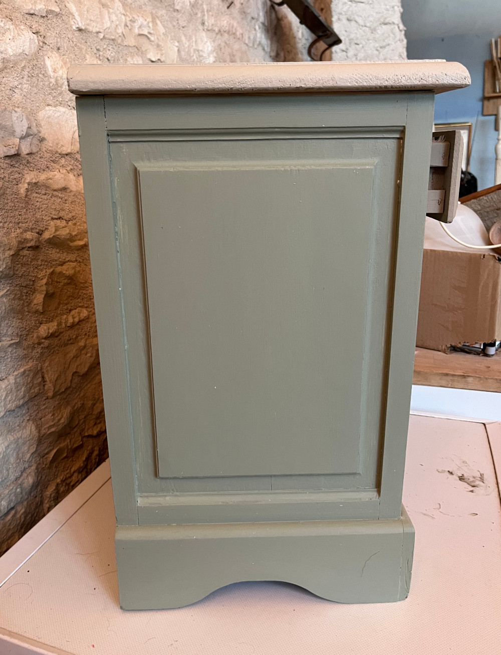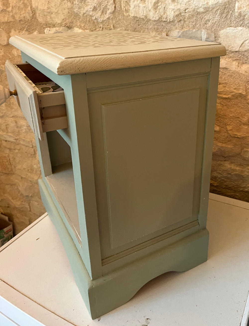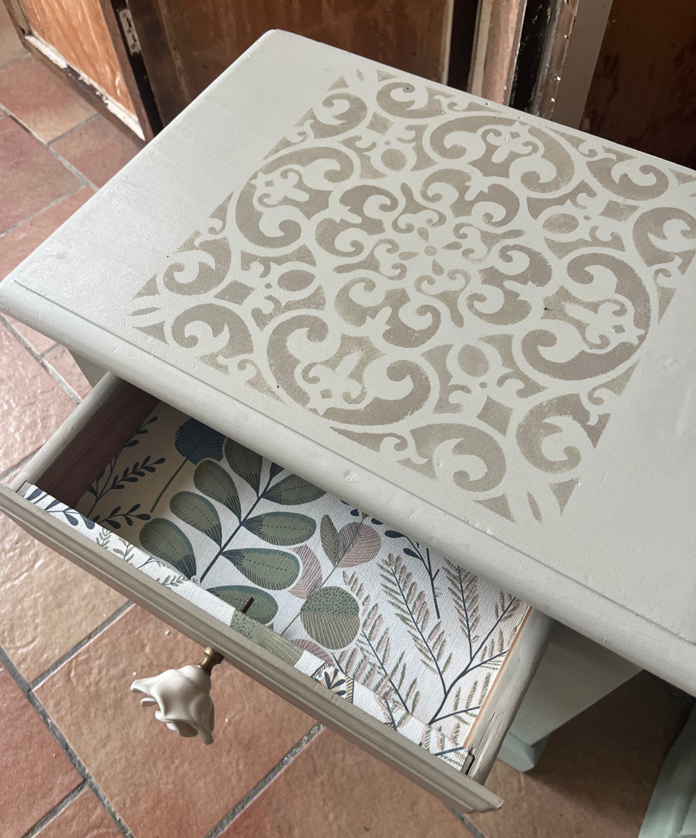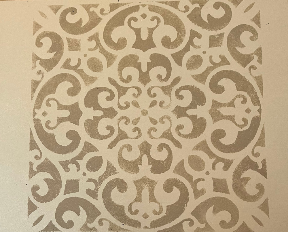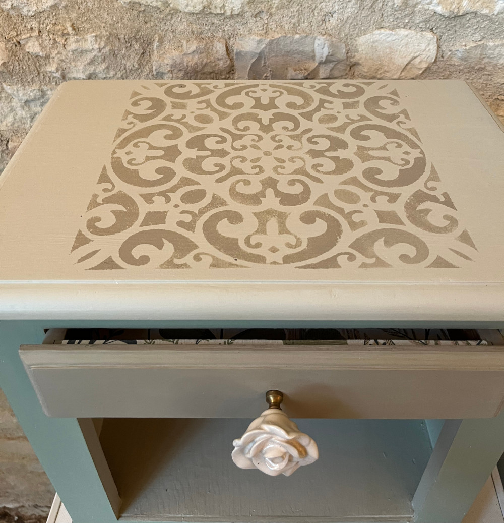 Enfin, un motif a été peint au pochoir sur le plateau