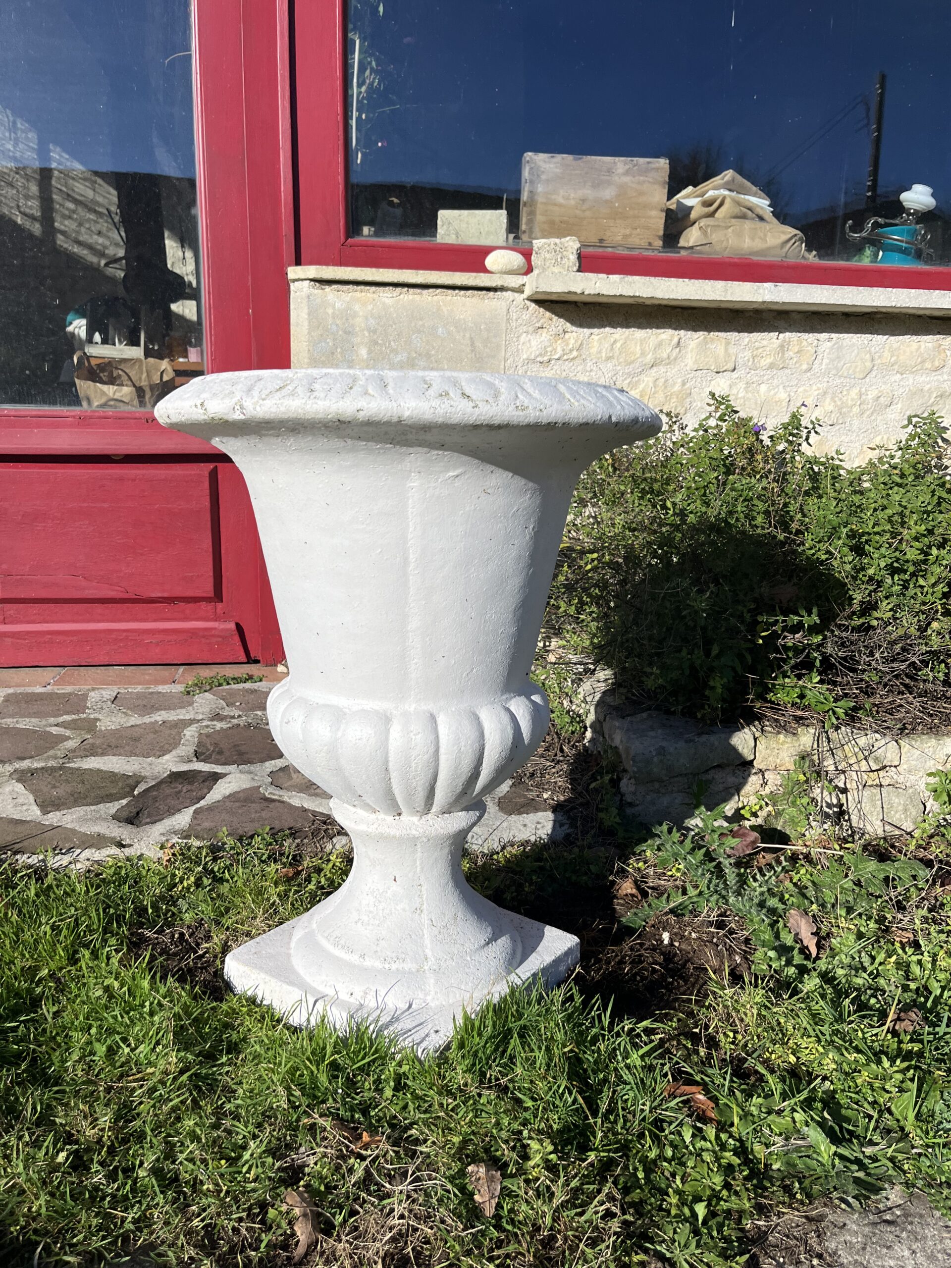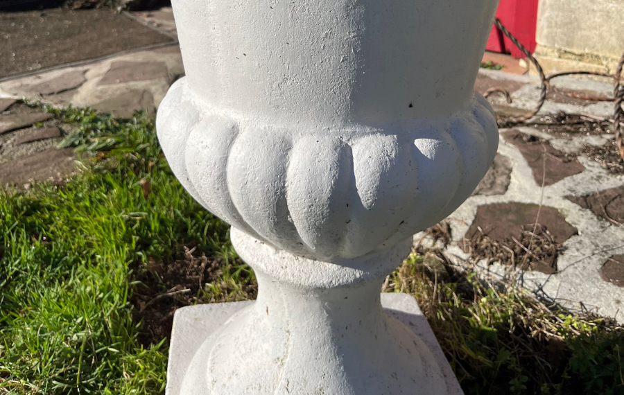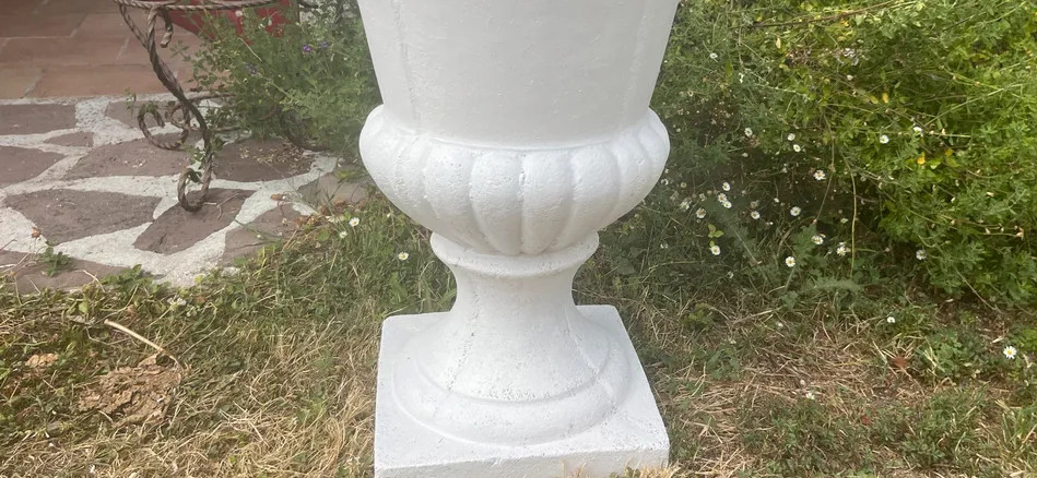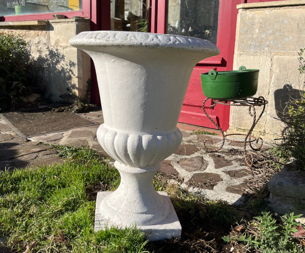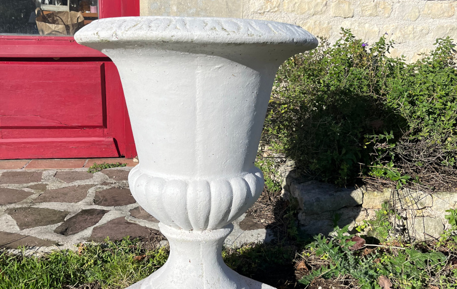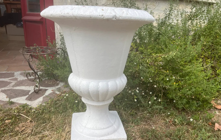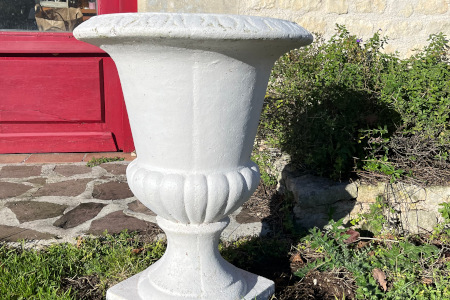 Beau vase de Médicis blanc « Grandon et Fres » en pierre reconstituée. Il ne craint pas le gel.