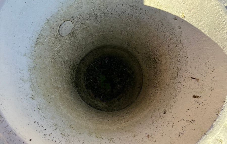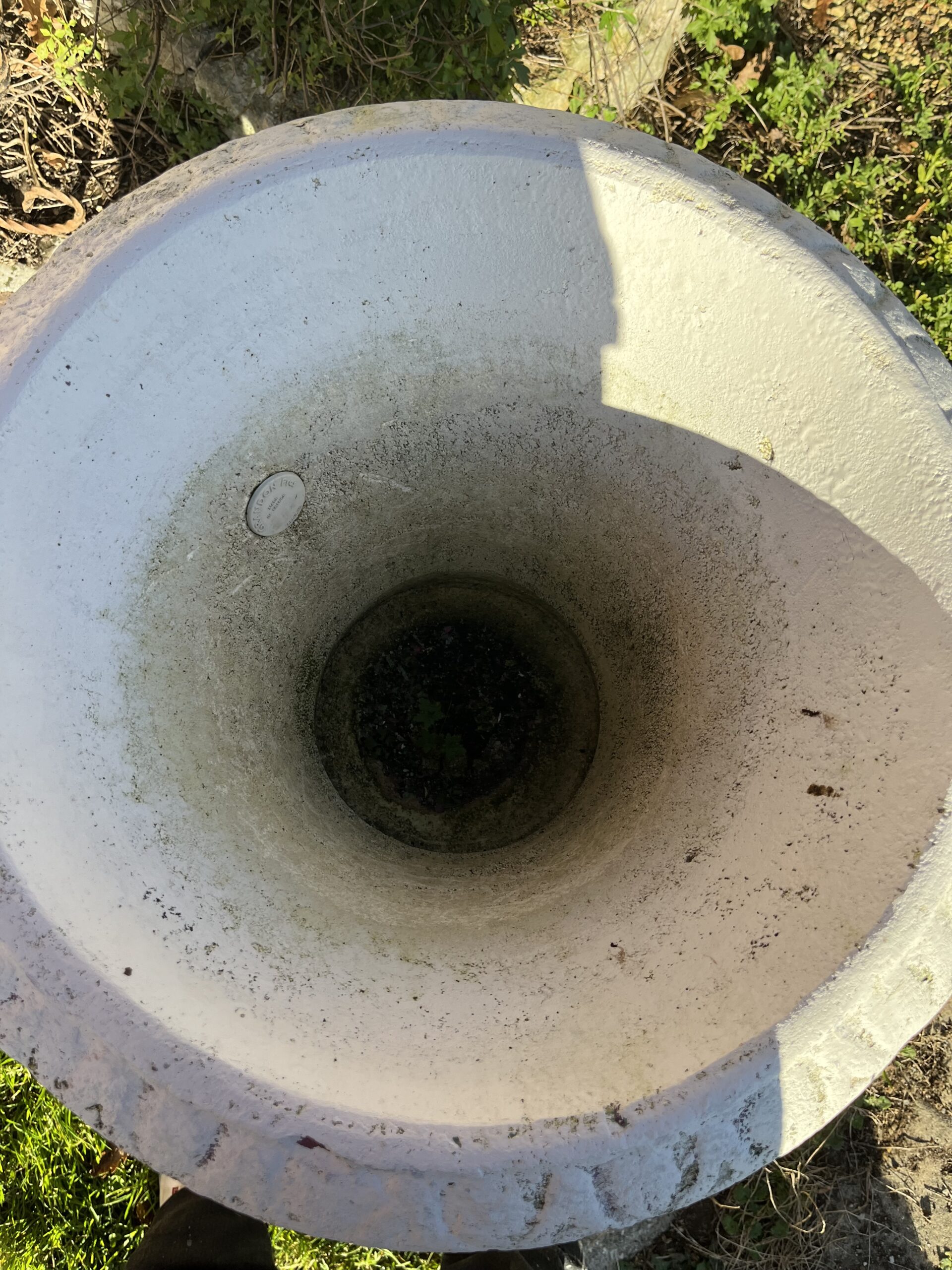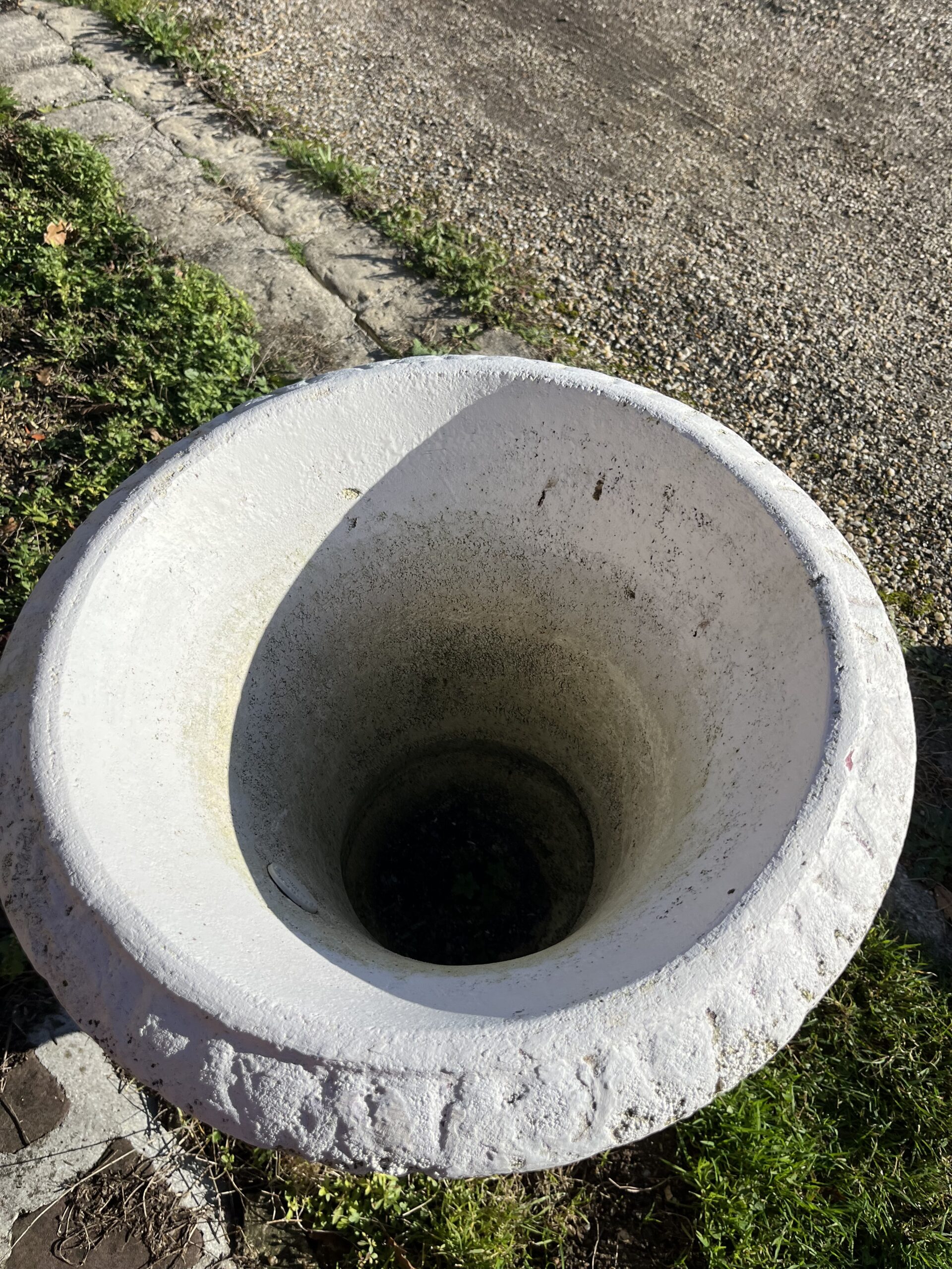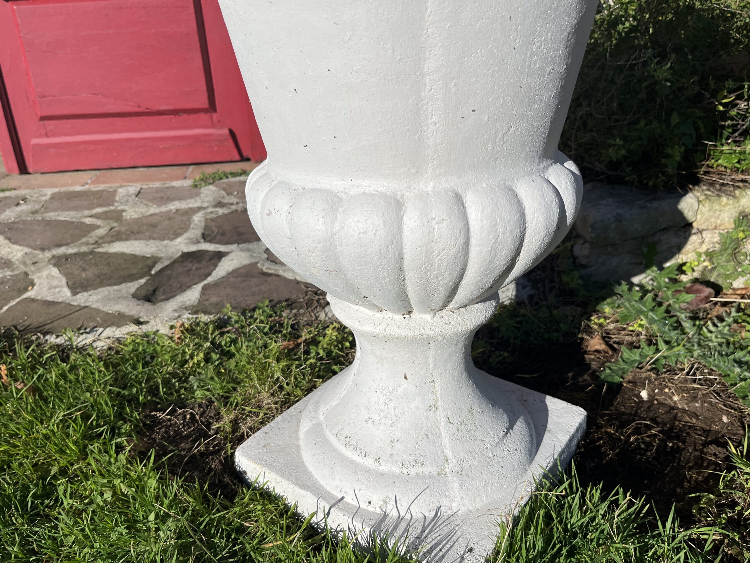 Beau vase de Médicis blanc « Grandon et Fres » en pierre reconstituée. Il ne craint pas le gel.